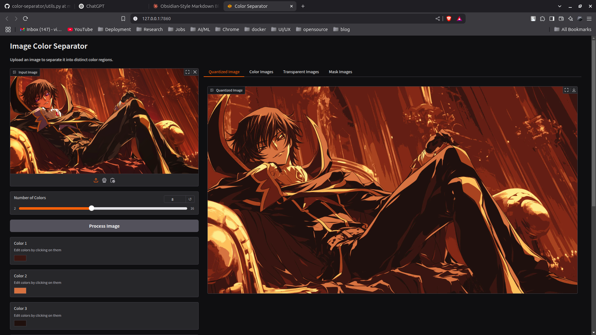 Color Separator leverages the power of K-means clustering from OpenCV to provide precise and efficient color quantization. This makes it an invaluable tool for tasks that require detailed color analysis and manipulation.
