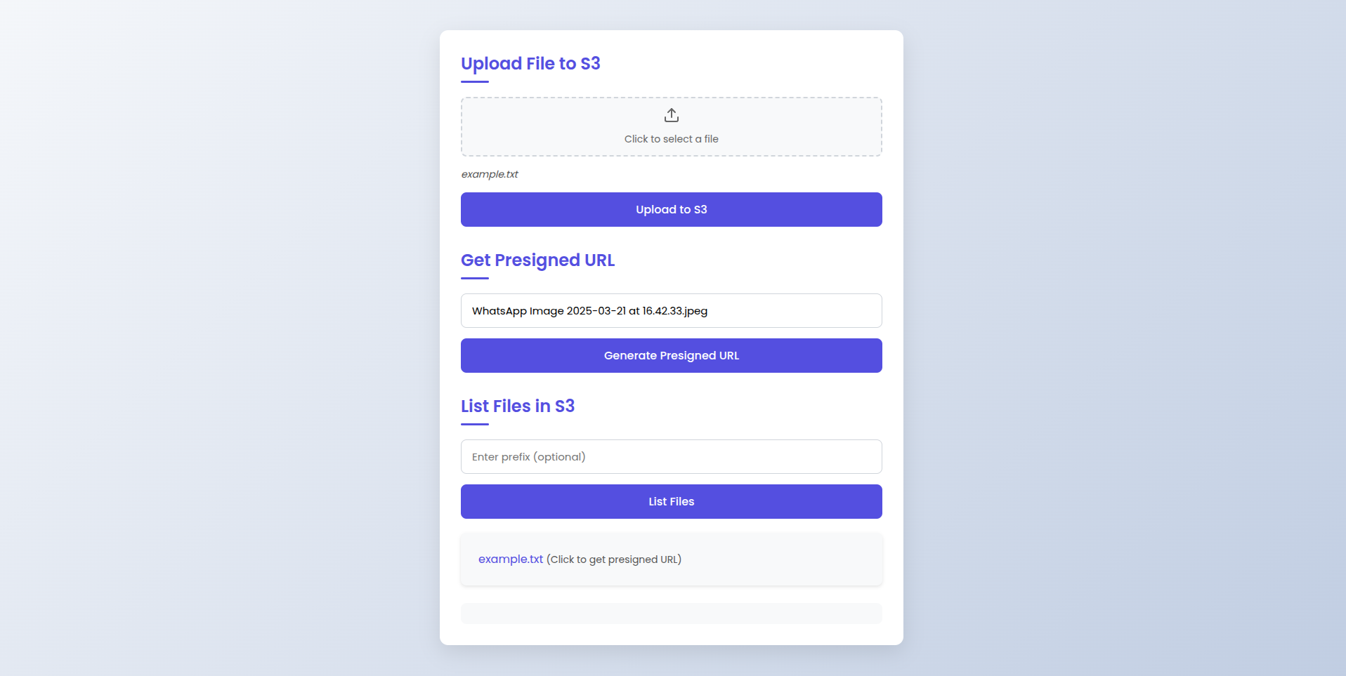 The frontend interface provides a user-friendly way to interact with an AWS Lambda function to perform three main actions: uploading files to S3, generating presigned URLs, and listing files in an S3 bucket. Here’s how to use each section: